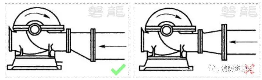 水泵进出口变径的目的是确保水流通畅的情况下,保证气蚀余量,避免气蚀现象的发生,提高输送效率,使水泵工作状态良好稳定。 气蚀对水泵的危害主要表现为过流部件损坏、性能下降以及振动噪声加剧。气蚀发生时,气泡溃灭产生的高频冲击会侵蚀叶轮、泵壳等金属部件,同时引发流量、扬程和效率的显著降低,并伴随剧烈振动和噪音,严重影响水泵使用寿命和运行稳定性。 水泵运转时,吸水管路的水压降低,溶解在水中的气体可能释放出来,当吸水管路存在倒坡或局部升高时,即可形成气囊。气囊累积后可能以较大气团(气泡)的形式进入泵体,影响水泵流量扬程性能,并产生震动及叶轮损坏等类似气蚀损害,有必要加以防范。 避免管路局部升高,采取合理的管路布置形式和管路坡度,可有效防范水泵吸水管路气囊的产生。 水泵的吸入口通常需要较大的管径,这是因为水泵为了有较高的运行效率,需要小的截面积及比较高的流速,因而水泵吸入口处于低压区,水的密度较小,为了满足供水平衡要求和保证入口有一定的压头,防止汽蚀,吸入口的管径需要比水泵吸入口大,这样可以使吸入口管道内流速慢且有足够的水量被吸入水泵。水泵吸入口以平头变径连接,平头向上,这样可以减少管内集气及避免涡流产生。 如果水泵吸入口叶轮处的最低压力等于或小于输送温度下液体的饱和蒸气压时,液体可能会气化,溶解在液体中的气体也会析出并形成气泡。这些气泡在进入高压区破灭时会会对叶片产生巨大的冲击并引起震动,导致叶片损坏,这就是气蚀现象。吸入口管径增大,可以有效防止气蚀现象发生。 水泵出口管道也需要扩径,通常水泵出口与管道以同心变径相连,其目的主要是为了降低流体在管道内的流速,减少流通在管道内运行阻力,从而减少水泵输配能源消耗。同时出口管道扩径还可以降低水流噪声。 水泵进出口的变径安装提高了水泵运行效率,降低了水流脉动,减少了水流噪声,是对水泵及管道的一种保护措施。 一、下游管路管顶不低于上游管路,是避免管路局部升高的基本保障措施 水泵吸水管路的倒坡和局部升高,是造成气囊的主要原因,避免倒坡和管路局部升高,应确保下游管路的管顶不低于上游管路,现实应用中,应注意以下情况: 1、水泵入口的异径管,应采用偏心异径管,并应采取管顶相平的连接方式 在图示2中,吸水管与吸水干管的连接①,以及吸水干管与水池引入管的连接②,应采用下游与上游管顶相平(图示3),或采用下游管顶高于上游管顶(图示4、图示5)的方式。 图示6、图示7的水泵吸水管与吸水干管连接,均未采用管顶平接,不宜采用。
